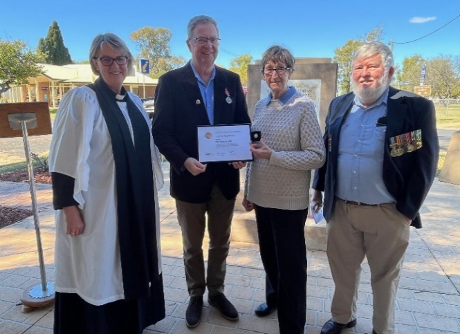 We joined the Global Nurses and Midwives Changeover via Zoom as we have done for the past two years. This year was going to be extra special as we had a role in presenting member Jeff Potter with Paul Harris Fellow recognition during the changeover. All went very smoothly till the day of the changeover when Jeff couldn’t attend our club dinner because of illness. We had the certificate and pin all ready (photo at left), We weren’t deterred though, as we did present Jeff with his Paul Harris Fellow recognition following the VP commemorations. President, Win made the presentation with fellow Rotarians and Jeff’s wife, Donna, present as well as a small group of community people who had also attended the commemorations. It was a very fitting way to recognise Jeff’s service to Rotary as well as the wider community. The Global Nurses and Midwives Rotary Club expressed this very well when saying, ‘The presentation carried even deeper resonance as it followed the St George commemoration of VP Day at the Cenotaph, where the community gathered to honour history, sacrifice, and service. Against this backdrop, Jeff’s award symbolised the same spirit of dedication and selfless contribution.’